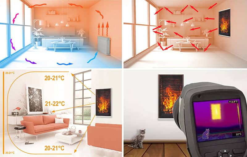 Dans le chauffage traditionnel, le vecteur de chaleur est l’air, l’air chaud monte vers le haut, donc l’endroit près du sol est le plus froid. La différence entre la température au sol et sous le plafond peut aller jusqu’à 10°C. En revanche, un radiateur infrarouge assure une différence de 2°C maximum entre ces deux températures. Il s’agit d’une différence significative par rapport au chauffage traditionnel. Comme les murs sont chauffés et que la chaleur est transférée dans la pièce, le confort thermique souhaité est atteint avec une consommation d’énergie moindre.