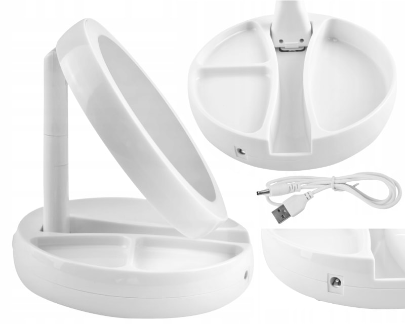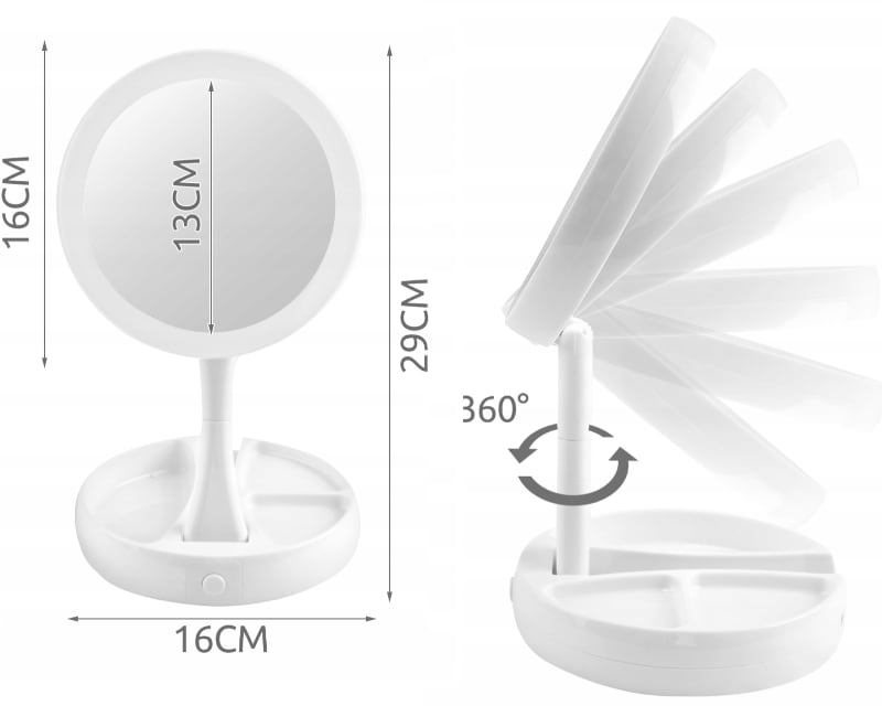 - PRZENOŚNE – lusterko podświetlane LED posiada możliwość całkowitego złożenia, po czym zajmuje niewiele miejsca. Zasilane jest bateriami – możesz postawić je, gdzie tylko chcesz, nie martwiąc się o źródło zasilania lub używając przewodu dołączonego do zestawu – wybór należy do Ciebie. Sprawdzi się zarówno w domu, salonie kosmetycznym jak i podczas podróży. Jego designerski wygląd i pełna funkcjonalność sprawia, że doskonale nadaje się jako pomysł na prezent.